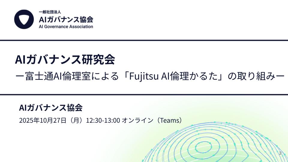 2025年10月27日(月)に富士通株式会社様にご登壇いただき、「富士通AI倫理室によるAI倫理かるたの取り組み」をテーマに扱うAIガバナンス研究会を開催しました。